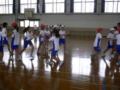 先生の合図に合わせて手をたたきながら歩き,「違うクラスの人と集まろう!」などの合図で2人組になったり3人組になったりして,ゲームをしました。最後は12人組で難しいゲームにも挑戦しました。