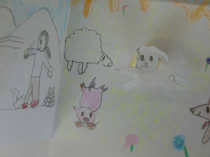 冷蔵庫の扉を開けたら,どんな世界が広がっているか想像しながら描きます。中には,前回に学習した「とび出すカード」の仕組みを生かして作品を作っている子どももいました。