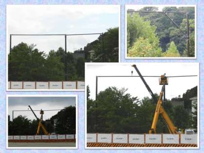 さて,この日,防球ネット設置工事は3日目を迎えました。ポールとポールを繋ぐバーが取り付けられています。明日にはこの作業が終わり,フェンスも無くなって,もう少し広く運動場が使えそうですね。