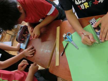 みんなでたくさんの1平方センチメートルを作ります。そして1平方メートルの上に貼っていきます。