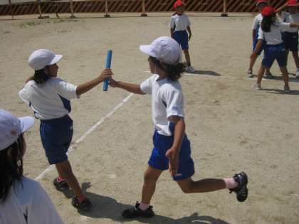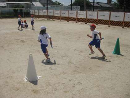 体育で取り組んでいるリレーでは,バトンパスが上達してきました。「後ろに手を出しながら走るんやで。」「バトンを渡す人は,そっと置くように渡すといいよ。」などと,教え合いながら頑張っています。初めと比べると,どんどん速くなってきています。