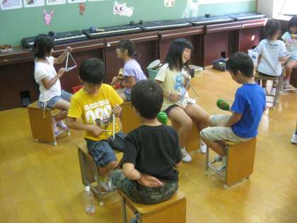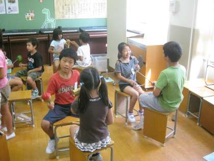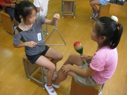 タンブリンやマラカス,ウッドブロック,ギロなどを使って,リズム遊びをしました。2人組になり,楽器を使ってつくったリズムで呼びかけたり答えたりしていく中で,「むずかしいリズムで,わからなかった〜。」や「全部同じリズムで返事ができたよ。」などと話し,とっても楽しく行うことができたようでした。