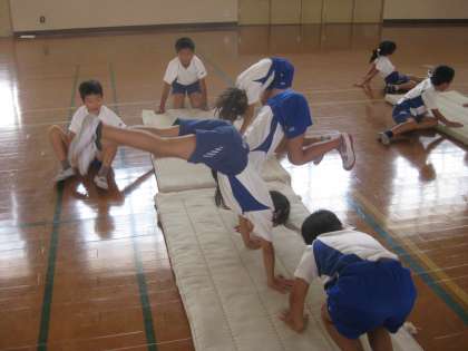今日は,動物の動きのようにマットの上を進んだり,前まわりや側転などの出来る技を確かめたりしました。来週から,できる技を繰り返したり,新たな技に挑戦したりしていきます。頑張りましょう!
