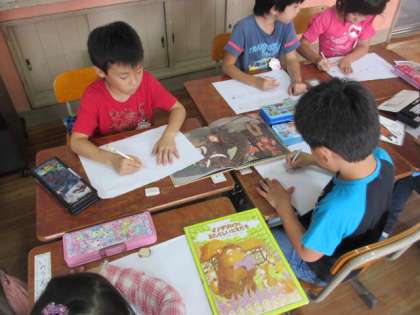 今日は,絵にしたい場面に出てくる生き物の絵を描きました。