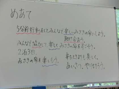 今日の話し合いで出てきた,「5分前行動」「協力」「楽しいみさきの家にしよう」という3つの言葉を基に,リーダーさんがめあてを考えてくれます。