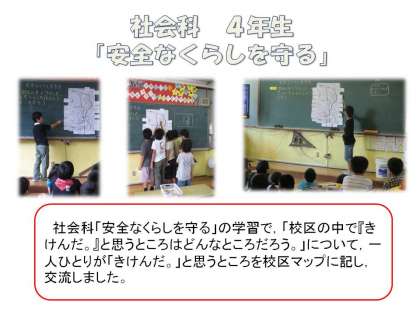 社会科「安全なくらしを守る」の学習で,校区の中で「危険だ。」と思うところを校区マップに記し,そのことをクラス全体で交流しました。