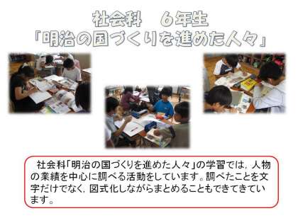 社会科「明治の国づくりを進めた人々」の学習では,ペリーや西郷隆盛,板垣退助などの人物を取り上げ,人物の業績を中心に調べています。
