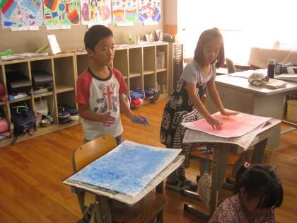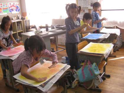 お話の絵の背景作りをしました。自分のイメージに合った背景の色を,絵の具で表現しました。手のひらに絵の具を出して,パンパンと画用紙にぬたくっていきました。とってもきれいな世界に一つしかない背景が出来上がりました。