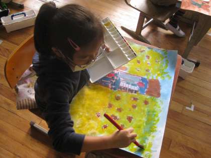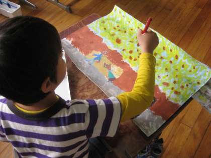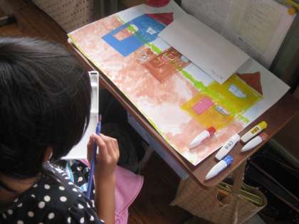 アイデアスケッチから画用紙に下がきを行い,今は絵の具を塗っています。