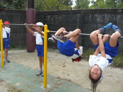 さかあがりやこうもりおり,ちきゅうまわりなどの技を練習します。いろいろな技に挑戦して,できる技を増やしていきましょうね。