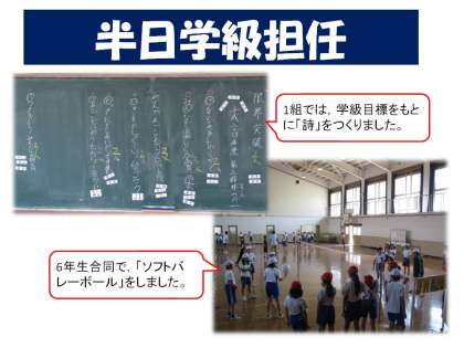 10月15日(月)は,「半日学級担任」を行いました。学級目標を詩で表したり,体育科でソフトバレーボールをしたりしました。