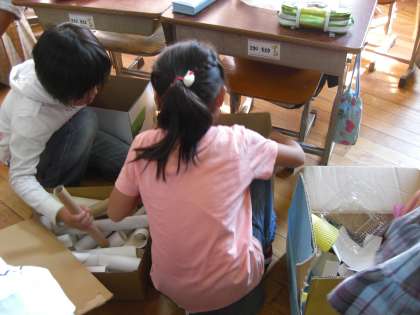 生活科の新しい単元「あそんで ためして くふうして」の学習をしました。お家で集めてきた材料を,「これは,この箱に入れよう。」「このカップとこの入れものは,同じ箱に入れよう。」と,みんなで分類しました。