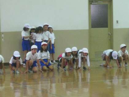 雨のため,運動場で体育のてつぼうあそびができなかったので,体育館で,台風の目ゲームと王様を守るおにごっこをしました。