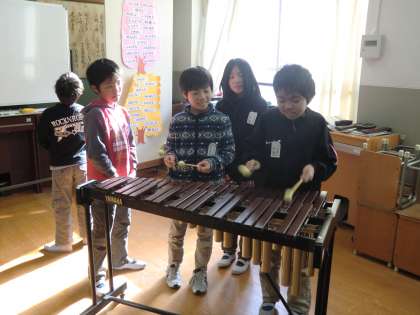 4年生は,音楽の学習で,友達のリズムを真似しながら,かけ合いの音楽をつくっています。
