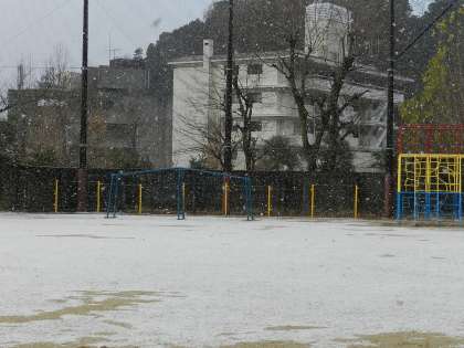 朝7時半頃,学校に着いたときには運動場になかった雪が,中間休み前にはうっすら・・・。
