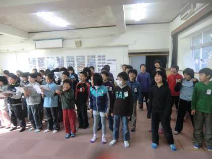 合唱では,3年生が歌う主旋律と,4年生が歌う副次的な旋律を重ねて歌うのは初めてだったのですが,初めてとは思えないほど美しいハーモニーがミーティングルームに響き渡っていました。聴いている各担任も,その歌声に感動してしまうほどでした。