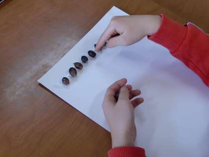 たんぽぽ学級に大量のドングリがやってきました。100より大きな数を学習するために,ドングリを数える学習を行いました。「1列に10こ,画用紙1枚に100こ」になるようにドングリを貼っていきます。