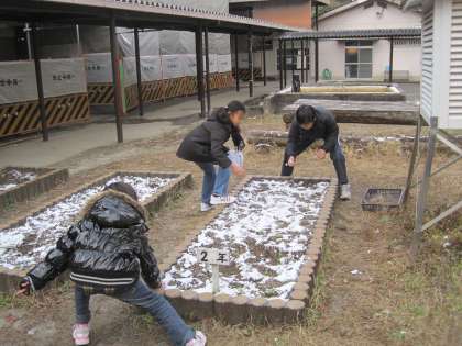 中には,花壇に残った雪で遊ぶ子どもたちも…。