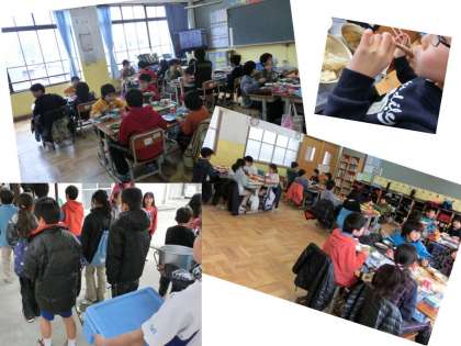 冷たいのを我慢しながら手を洗い,お盆を洗い,しっかり用意してくれます。配膳して残った分も配るので,食缶はからっぽ。本当によく食べてくれます。給食の時間は幸せそうな笑顔がたくさん♪