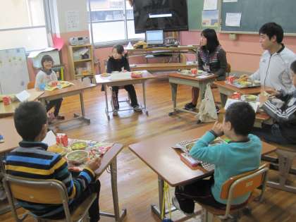3年生から毎週4人ずつたんぽぽ学級へ行き,一緒に給食を食べます。