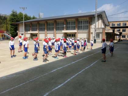 初めの体操も慣れたもので,そろってしっかりやってくれます。