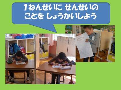 国語で「先生のことを紹介しよう」に取り組んでいます。今日は新しく入った1年生に,学校の先生を紹介するためのワークシートを作りました。また,先生に誕生日を聞くために「誕生日,教えてください」という絵入の紙を作り,紙に合わせて話す練習をしました。