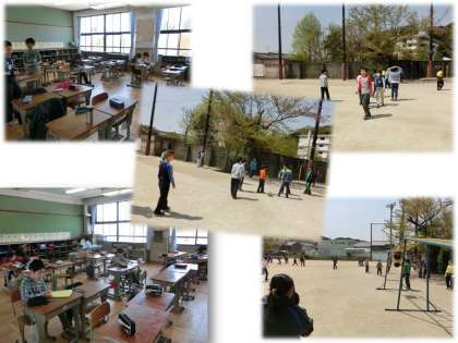 運動場では鉄棒,うんてい,一輪車,ボール遊び。