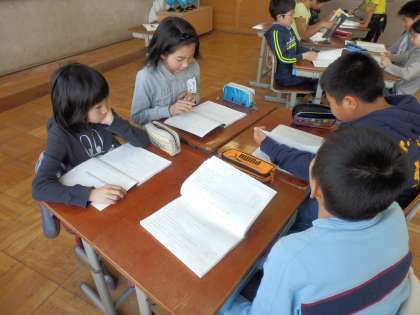 その後,グループで役割を決めて,中心人物の心情の変化や場面の移り変わりが分かるような工夫を考え,音読発表をしました。