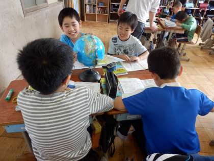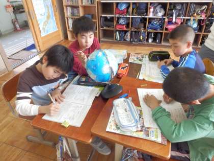 地球儀や世界地図,地図帳を使って日本の位置を説明するにはどうしたら分かりやすいか話し合っています。