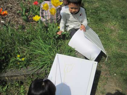 中庭や運動場に咲いている花や草と友だちをモデルにしました。
