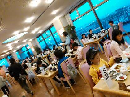 午後7時。ディナータイムです。豪華なメニューにびっくり!班の友だちと、楽しそうに話をしながら、いただいています。