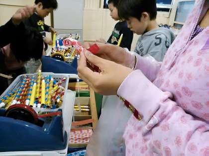 修学旅行最後の活動場所、吹き戻しの里に着きました。成り立ちや作り方の説明を伺って、早速作り始めました。これも、お土産に持って帰ります。