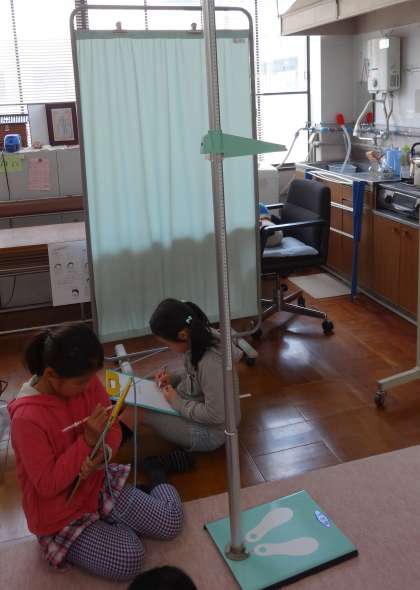 保健室にある身長計や座高計,家庭科室にあるはかりなどを描いています。