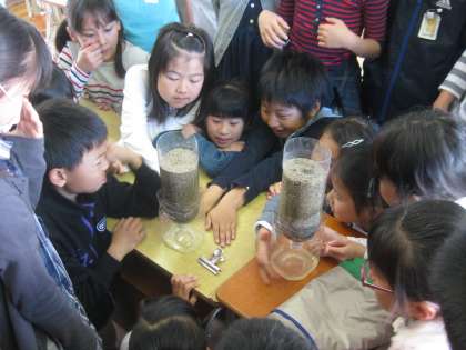 今日は,ろ過装置を使って,泥水や琵琶湖の水をきれいにしました。