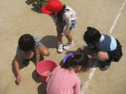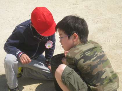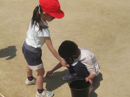 清掃の時間に,3年生と1年生が運動場の石拾いをしてくれています。