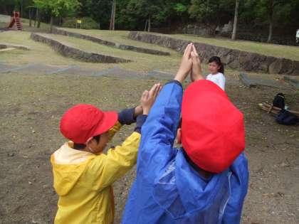 雨が降っているので,みんなで木の下でお弁当を食べました。