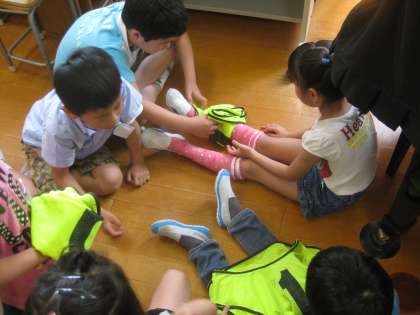 3年生がゼッケンのたたみ方,しまい方を1年生に教えてくれています。