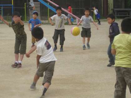中庭でお花を摘む子,ドッジボールをする子,魚の様子を観察する子・・・。
