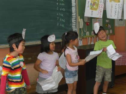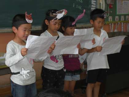 第一回目の音読発表会をしました。初めてみんなの前で発表したので,なかなか上手くいきませんでした。声が小さかったり,間が空きすぎたり…自分達はとても楽しかったのですが,聞いている人には,うまく伝わらなかったみたいです。もう一度,グループで話し合って練習をして,明日,第2回目を行う予定です。