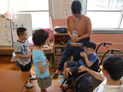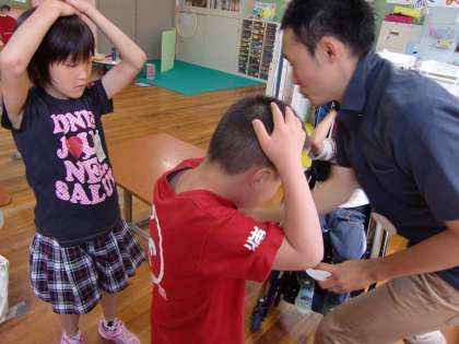 音楽では,「おちたおちた」に取り組んでいます。かみなりが落ちた時は,お腹をおさえておへそをとられないようにしています。つぎは何が落ちてくるのかなと,考えながらみんなで楽しく取り組みました。