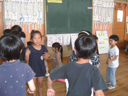 音楽の時間,二人組で“なべなべそこぬけ”をしました。どんどん相手の友達が変わっていきます。変わる度に子ども達の歓声があがりました。今日は,いろいろなわらべうたを歌いました。