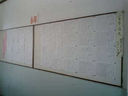 下の写真は,「200字作文」です。第一回目は,「六年生になって」という題で書きました。廊下の掲示板に掲示していますので,参観日の機会にでもご覧下さい。二回目以降は,ファイルにとじていきます。