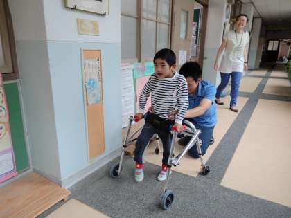 自立活動の時間です。体の緊張を緩めた後は,実際に自分の体を動かします。今回は,ウォーカー(歩行器)を使って歩行の練習をしています。「ワン・ツー,ワン・ツー」の声にあわせて,右足,左足を交互に前に出し,一歩ずつ地面を踏みしめて前進します。学校の廊下で練習していると,通りがかった先生がたくさん応援してくれます。応援を励みに,頑張っています。