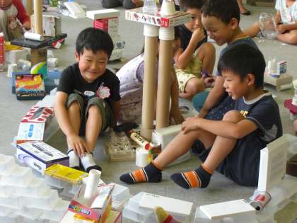 子ども達が,家で集めてきた空き缶や箱をならべたり積んだりして作品を作りました。最初は,一人で作りました。そして,グループで作りました。ロボットやお城…グループで作りはじめると,すごい作品ができ上がりました。