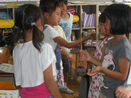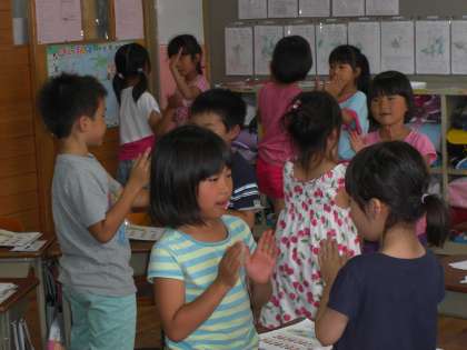 いろいろなリズムを一人ひとり作りました。それを隣の友だちとリレーをして打ちました。その後“ぶんぶんぶん”の曲に合わせて,リズム打ちをした後,二人組で踊りました。体でいっぱいリズムを感じました。