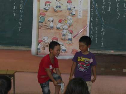 教科書の絵を見て,どんなお話をしているのかを,隣のお友達と考えました。そして,みんなの前でお話しました。様子がよくわかる言葉でお話を考えることができました。