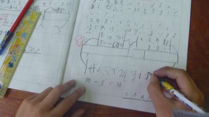 みんなでテープ図のかき方を練習していくうちに,「ぜんぶで30こだから・・・」「はじめの数がわからないから・・・」と自分でテープ図をかけるようになってきました♪