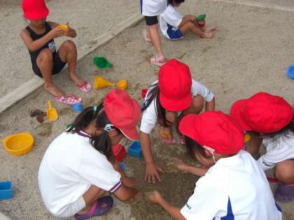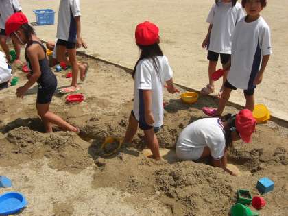 「楽しかった〜。」砂や土でお団子を作ったり山を作ったり…最後には,大きな川が出来上がりました。まだまだ,続けたかった子ども達でしたが,プールに入る時間になったので,片づけをして,プールへゴー。いっぱい楽しく学習した一日でした。