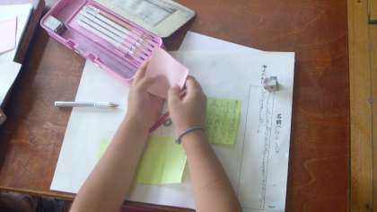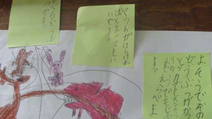 あったらいいなと思うものの絵をかいて,そのまわりに説明を書いた付箋を貼って行きました。