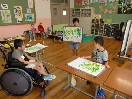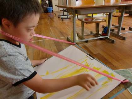 今日は,すくすく育ってきたとうもろこしの絵を描きました。今日はとっても暑いので,とうもろこしの写真を,子どもたちは自分で撮影し,教室で画板を使ったり,壁に紙をかけて描きました。画板で描くと,絵描きさんのような気分になりましたね。最後には,みんなの絵を鑑賞し合う活動もしました。